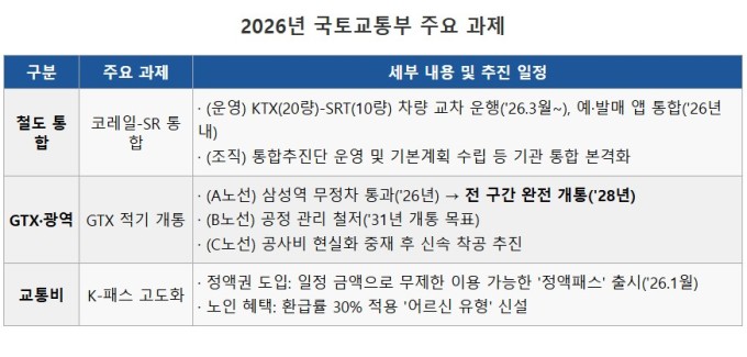 12일 국토교통부는 세종컨벤션센터에서 열린 대통령 업무보고 자리에서 '2026년도 국토교통부 업무보고'를 발표하며 '교통 혁신 : 누구에게나 편리하고 부담없는 교통서비스 제공'을 주제로 철도 및 교통 서비스 혁신을 위한 구체적인 로드맵을 제시했다.