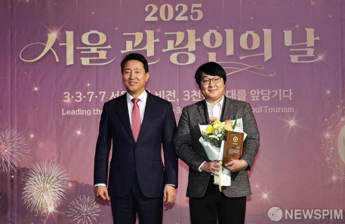 [서울=뉴스핌] 양윤모 기자 = 오세훈 서울시장이 12일 오후 서초구 세빛섬 플로팅 아일랜드에서 개최된 '2025 서울관광인의 날 및 서울관광대상 시상식' 행사에 참석해 이규하 아시아나항공(주) 과장에게 서울관광홍보 대상 표창패를 수여후 기념촬영을 하고 있다. 2025.12.12 yym58@newspim.com
