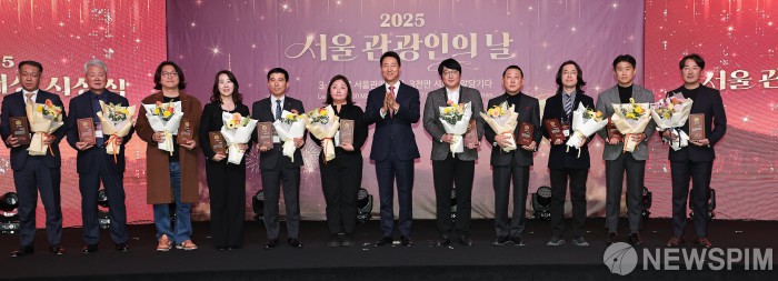 [서울=뉴스핌] 양윤모 기자 = 오세훈 서울시장이 12일 오후 서초구 세빛섬 플로팅 아일랜드에서 개최된 '2025 서울관광인의 날 및 서울관광대상 시상식' 행사에 참석해 서울관광대상 수상자들과 기념촬영을 하고 있다. 2025.12.12 yym58@newspim.com