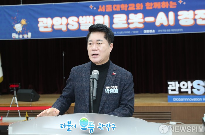 [서울=뉴스핌] 박준희 관악구청장 13일 서울 관악구청 대강당에서 개최된 '관악S밸리 로봇·인공지능(AI) 경진대회'에 참석해 인사말을 하고 있다. 박 구청장은 “서울대와 함께 미래 기술을 배우고 도전할 수 있는 환경을 만들고 있다”며, “참가 학생들이 훗날 관악S밸리에서 세계를 놀라게 할 혁신 리더가 되기를 바란다”고 강조하면 참가자들을 격려했다. 이번 행사는 관악중소벤처진흥원 주관, 서울대학교 창업지원단 협력으로 청소년의 첨단 기술 이해도를 높이고 로봇 조작 능력 및 문제해결력 강화를 위해 관내 초등학생 32명이 참가한 가운데 개최됐다. [사진=관악구청] 2025.12.13 photo@newspim.com
