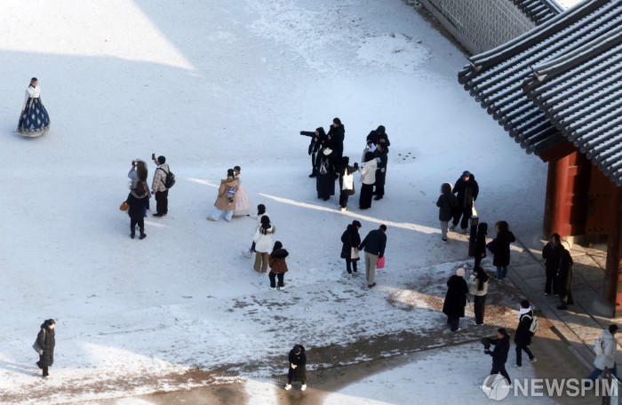 [서울=뉴스핌] 이길동 기자 = 14일 오전 서울 종로구 경복궁을 찾은 관광객들이 밤사이 내린 눈을 배경으로 사진을 찍고 있다. 2025.12.14 gdlee@newspim.com