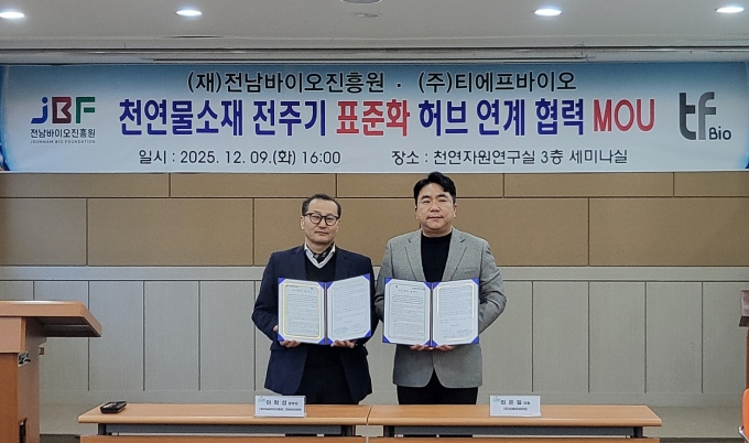 전남바이오진흥원은 최근 티에프바이오와 업무협약(MOU)을 체결하고 천연물소재의 전주기 표준화 체계 마련과 안정적 공급망 구축을 위한 협력을 강화하고 있다고 15일 밝혔다.