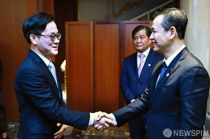 [서울=뉴스핌] 김정관 산업통상부 장관이 15일 서울 중구 롯데호텔에서 열린 한-라오스 산업통상장관 회담에서 말라이통 꼼마싯 라오스 산업통상부 장관과 악수하고 있다. [사진=산업통상부] 2025.12.15 photo@newspim.com