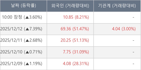 [서울=뉴스핌] 로보뉴스 = 15일 10시 15분 현재 비츠로테크(042370)는 전일 대비 3.60% (현재가 9,790원) 상승했고, 외국인이 최근 7일 연속 순매수(누적 118.81만 주, 잠정) 행진을 하고 있다.