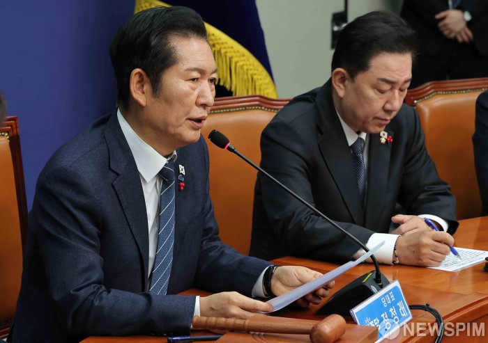 [서울=뉴스핌] 윤창빈 기자 = 정청래 더불어민주당 대표가 15일 서울 여의도 국회에서 열린 최고위원회의에서 모두발언을 하고 있다. 2025.12.15 pangbin@newspim.com