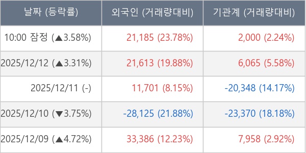 [장중수급포착] 동성화인텍, 외국인/기관 동시 순매수… 주가 +3.58%
