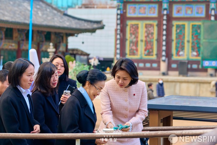 [서울=뉴스핌] 김혜경 여사와 라오스 국가주석 부인 날리 여사가 지난 14일 서울 종로구 조계사를 방문하고 있다. [사진=대통령실] 2025.12.15 photo@newspim.com