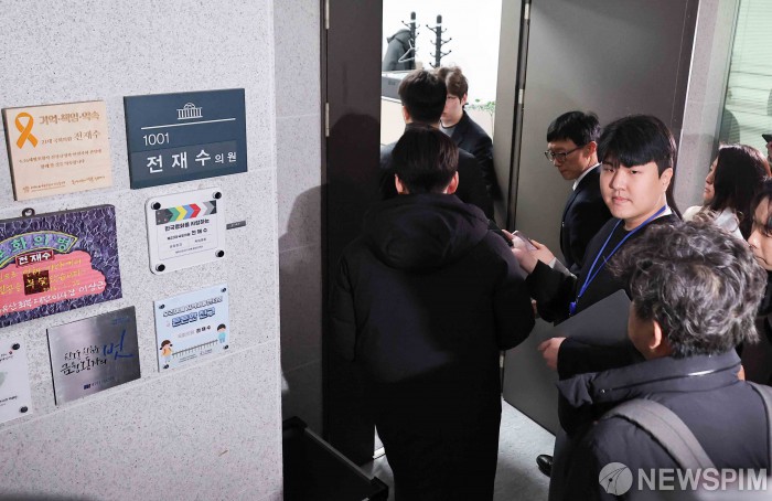 [서울=뉴스핌] 윤창빈 기자 = 통일교로부터 금품을 수수했다는 의혹을 받고 있는 전재수 전 해양수산부 장관을 압수수색 하기 위해 15일 서울 여의도 국회 의원회관에 마련된 전 전 장관의 사무실로 경찰청 특별전담수사팀이 들어서고 있다. 2025.12.15 pangbin@newspim.com