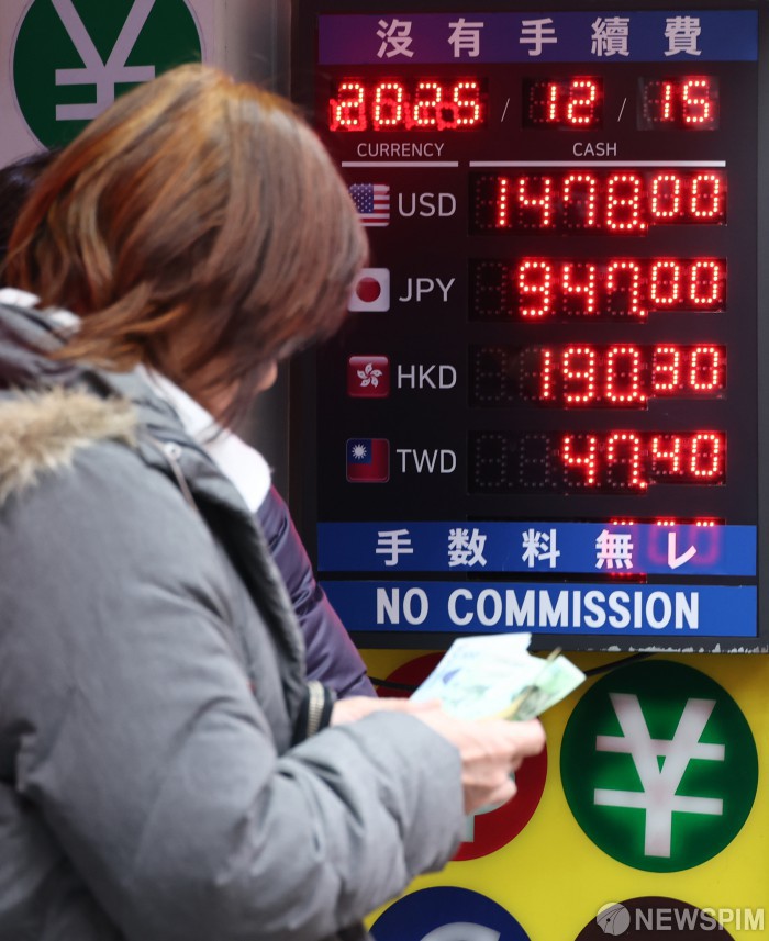 [서울=뉴스핌] 최지환 기자 = 달러/원 환율 오름세가 이어지며 외환당국이 대응책 마련을 논의 중인 가운데 15일 오후 서울 중구 명동 거리의 한 환전소에 환율이 표시되어 있다. 2025.12.15 choipix16@newspim.com