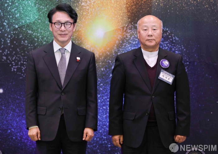 [서울=뉴스핌] 윤창빈 기자 = 김민석 국무총리가 15일 서울 여의도 국회 박물관에서 열린 사회대개혁위원회 출범 및 개혁과제 수립을 위한 정책포럼에서 박석운 위원장에게 임명장 수여를 마치고 기념촬영을 하고 있다. 2025.12.15 pangbin@newspim.com