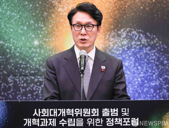 [서울=뉴스핌] 윤창빈 기자 = 김민석 국무총리가 15일 서울 여의도 국회 박물관에서 열린 사회대개혁위원회 출범 및 개혁과제 수립을 위한 정책포럼에서 축사를 하고 있다. 2025.12.15 pangbin@newspim.com