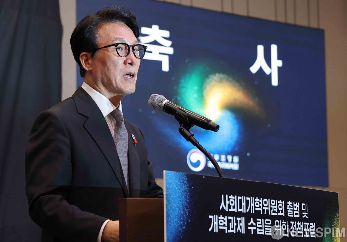 [서울=뉴스핌] 윤창빈 기자 = 김민석 국무총리가 15일 서울 여의도 국회 박물관에서 열린 사회대개혁위원회 출범 및 개혁과제 수립을 위한 정책포럼에서 축사를 하고 있다. 2025.12.15 pangbin@newspim.com