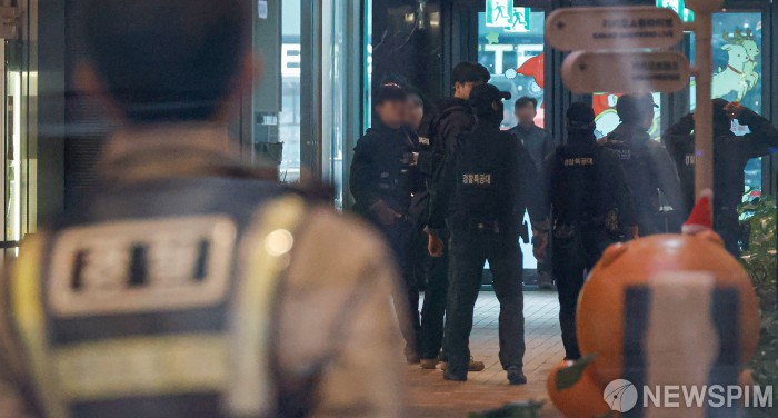 [성남=뉴스핌] 류기찬 기자 = 15일 오후 경기 성남시 분당구 카카오 판교 사옥에 폭발물이 설치됐다는 협박 신고가 접수된 가운데 경찰 특공대가 수색을 벌이고 있다. 2025.12.15 ryuchan0925@newspim.com