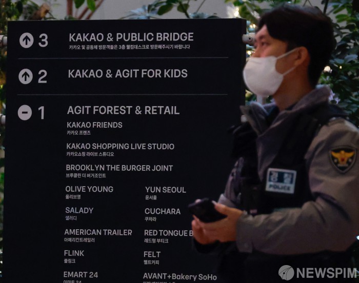 [성남=뉴스핌] 류기찬 기자 = 15일 오후 경기 성남시 분당구 카카오 판교 사옥에 폭발물이 설치됐다는 협박 신고가 접수됐다. 경찰과 군이 사옥 내부와 주변에 대한 수색과 탐지 작업을 진행중이다. 카카오 판교 사옥 출입이 통제되고 있다. 2025.12.15 ryuchan0925@newspim.com