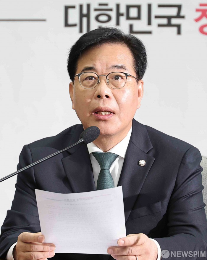 [서울=뉴스핌] 윤창빈 기자 = 송언석 국민의힘 원내대표가 16일 서울 여의도 국회에서 열린 원내대책회의에서 모두발언을 하고 있다. 2025.12.16 pangbin@newspim.com