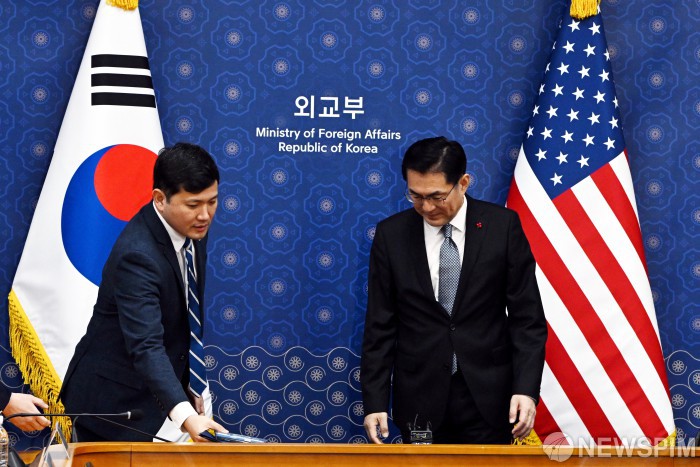 [서울=뉴스핌] 이길동 기자 = 정연두 외교전략정보본부장과 케빈 킴 미 대사대리가 16일 오전 서울 종로구 정부서울청사 별관에서 열린 한미 정상회담 'Joint Fact Sheet' 후속 협의에 앞서 기념촬영을 하고 있다. 2025.12.16 gdlee@newspim.com