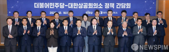 [서울=뉴스핌] 류기찬 기자 = 정청래 더불어민주당 대표(앞줄 왼쪽 여섯번째부터), 최태원 대한상공회의소 회장을 비롯한 참석자들이 16일 오전 서울 중구 대한상공회의소에 열린 '더불어민주당-대한상공회의소 정책간담회'에서 기념촬영을 하고 있다. 2025.12.16 ryuchan0925@newspim.com