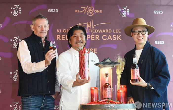 [서울=뉴스핌] 도정한 기원 위스키 대표(오른쪽)와 앤드류 샌드 마스터 블렌더, 흑백요리사 에드워드 리 셰프가 16일 오전 서울 마포구 홍대 라이즈 호텔에서 국내산 홍고추를 활용한 스모키하고 스파이시한 향미가 특징인 '레드 페퍼 캐스크' 위스키를 소개하고 있다. 기원 위스키는 오래 시간에 걸쳐 이중 숙성하는 방식으로 홍고추의 맛과 향, 바닐라·과실 향이 함께 구현되도록 설계했으며, ‘레드 페퍼 캐스크’는 GS리테일의 주류 스마트 오더 플랫폼 ‘와인25플러스(Wine25+)’를 통해 독점 판매된다. [사진=기원 위스키 ] 2025.12.16 photo@newspim.com