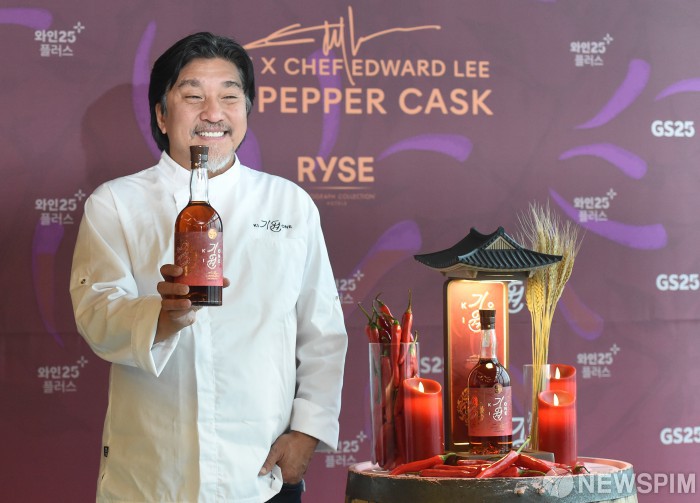 [서울=뉴스핌] 흑백요리사 에드워드 리 셰프가 16일 오전 서울 마포구 홍대 라이즈 호텔에서 기원(Ki One) 위스키와 협업으로 출시한 리미티드 에디션 ‘레드 페퍼 캐스크 (RED PEPPER CASK)' 제품 앞에서 포즈를 취하고 있다. 기원 위스키는 오래 시간에 걸쳐 이중 숙성하는 방식으로 홍고추의 맛과 향, 바닐라·과실 향이 함께 구현되도록 설계했으며, ‘레드 페퍼 캐스크’는 GS리테일의 주류 스마트 오더 플랫폼 ‘와인25플러스(Wine25+)’를 통해 독점 판매된다. [사진=기원 위스키 ] 2025.12.16 photo@newspim.com
