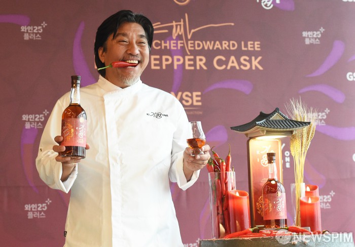[서울=뉴스핌] 흑백요리사 에드워드 리 셰프가 16일 오전 서울 마포구 홍대 라이즈 호텔에서 기원(Ki One) 위스키와 협업으로 출시한 리미티드 에디션 ‘레드 페퍼 캐스크 (RED PEPPER CASK)' 제품 앞에서 홍고추를 입에물고 포즈를 취하고 있다. 기원 위스키는 오래 시간에 걸쳐 이중 숙성하는 방식으로 홍고추의 맛과 향, 바닐라·과실 향이 함께 구현되도록 설계했으며, ‘레드 페퍼 캐스크’는 GS리테일의 주류 스마트 오더 플랫폼 ‘와인25플러스(Wine25+)’를 통해 독점 판매된다. [사진=기원 위스키 ] 2025.12.16 photo@newspim.com