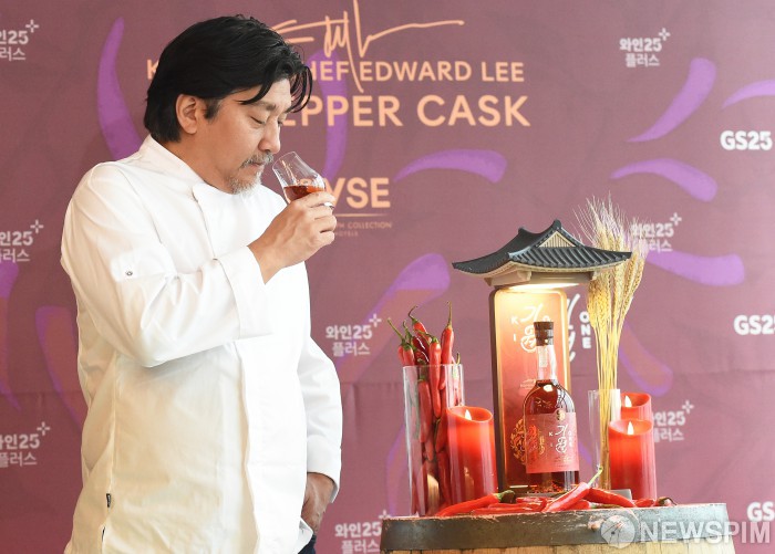 [서울=뉴스핌] 흑백요리사 에드워드 리 셰프가 16일 오전 서울 마포구 홍대 라이즈 호텔에서 기원(Ki One) 위스키와 협업으로 출시한 리미티드 에디션 ‘레드 페퍼 캐스크 (RED PEPPER CASK)' 출시 행사에서 제품의 향을 음미하고 있다. 기원 위스키는 오래 시간에 걸쳐 이중 숙성하는 방식으로 홍고추의 맛과 향, 바닐라·과실 향이 함께 구현되도록 설계했으며, ‘레드 페퍼 캐스크’는 GS리테일의 주류 스마트 오더 플랫폼 ‘와인25플러스(Wine25+)’를 통해 독점 판매된다. [사진=기원 위스키 ] 2025.12.16 photo@newspim.com