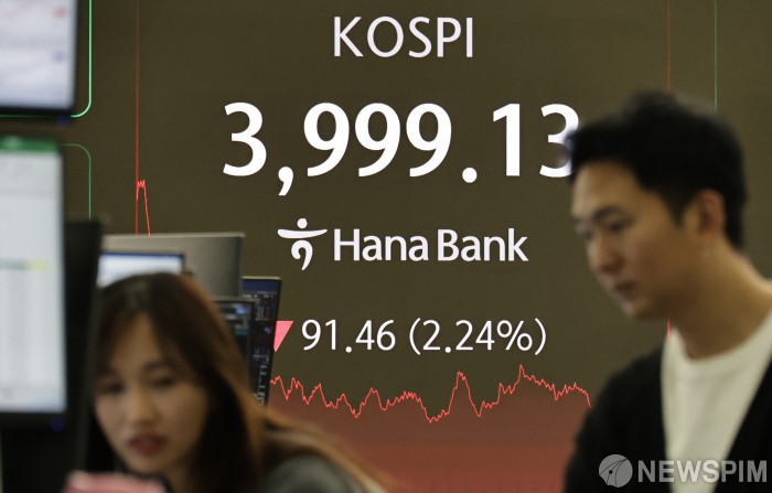 [서울=뉴스핌] 양윤모 기자 = 인공지능(AI) 거품론 및 미국 고용지표 발표에 대한 경계감으로 16일 오후 코스피가 전장 종가보다 91.46 포인트(2.24%) 하락하며 3999.13로, 코스닥은 22.72 포인트(2.42%) 하락한 916.11로 장을 마감한 가운데, 서울 중구 하나은행 딜링룸에서 직원들이 업무를 보고 있다. 서울외환시장에서 달러/원 환율은 전장 대비 4.80원 상승한 1475.80원에 주간거래를 마감했다. 2025.12.16 yym58@newspim.com