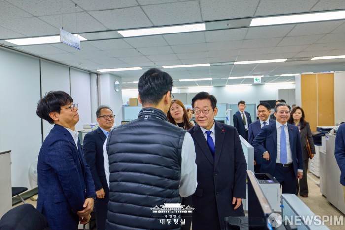 [서울=뉴스핌] 이재명 대통령이 16일 세종 나성동 국세청을 방문해 직원들을 격려하고 있다. [사진=대통령실] 2025.12.16 photo@newspim.com3