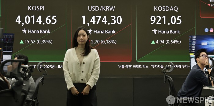 [서울=뉴스핌] 양윤모 기자 = 뉴욕 증시 3대 지수가 혼조세로 마감한 가운데, 17일 오전 코스피가 전장 종가보다 15.52 포인트(0.39%) 상승하며 4014.65로, 코스닥은 4.94 포인트(0.54%) 상승한 921.05로 장을 시작한 가운데, 서울 중구 하나은행 딜링룸에서 직원들이 업무를 보고 있다. 서울외환시장에서 달러/원 환율은 전장 대비 2.70원 하락한 1474.30원에 주간거래를 시작했다. 2025.12.17 yym58@newspim.com
