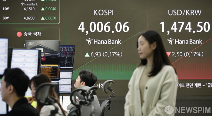 [서울=뉴스핌] 양윤모 기자 = 뉴욕 증시 3대 지수가 혼조세로 마감한 가운데, 17일 오전 코스피가 전장 종가보다 6.93 포인트(0.17%) 상승하며 4006.06으로, 코스닥은 4.94 포인트(0.54%) 상승한 921.05로 장을 시작한 가운데, 서울 중구 하나은행 딜링룸에서 직원들이 업무를 보고 있다. 서울외환시장에서 달러/원 환율은 전장 대비 2.50원 하락한 1474.50원에 주간거래를 시작했다. 2025.12.17 yym58@newspim.com