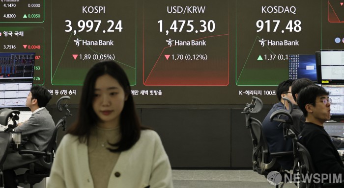 [서울=뉴스핌] 양윤모 기자 = 뉴욕 증시 3대 지수가 혼조세로 마감한 가운데, 17일 오전 코스피가 전장 종가보다 1.89 포인트(0.05%) 하락하며 3997.24로, 코스닥은 1.37 포인트(0.10%) 상승한 917.48로 장을 시작한 가운데, 서울 중구 하나은행 딜링룸에서 직원들이 업무를 보고 있다. 서울외환시장에서 달러/원 환율은 전장 대비 1.70원 하락한 1475.30원에 주간거래를 시작했다. 2025.12.17 yym58@newspim.com