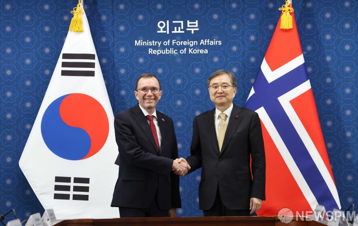 [서울=뉴스핌] 이길동 기자 =조현 외교부 장관(오른쪽)과 에스펜 바르트 아이데(Espen Barth Eide) 노르웨이 외교장관이 17일 서울 종로구 외교부 청사에서 열린 한-노르웨이 외교장관회담에 앞서 기념촬영을 하고 있다.2025.12.17 gdlee@newspim.com