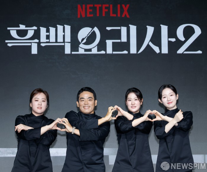 [서울=뉴스핌] 류기찬 기자 = 윤주모 셰프(왼쪽부터), 프렌치 파파, 중식마녀, 아기맹수가 17일 오전 서울 종로구 JW 메리어트 동대문 스퀘어 서울에서 열린 넷플릭스 예능 ‘흑백요리사: 요리 계급전쟁2’ 기자간담회에서 포즈를 취하고 있다. '흑백요리사2'는 오직 맛으로 계급을 뒤집으려는 재야의 고수 '흑수저' 셰프들과 이를 지키려는 대한민국 최고 수준의 스타 셰프 '백수저'들이 펼치는 요리 서바이벌 예능이다. 2025.12.17 ryuchan0925@newspim.com
