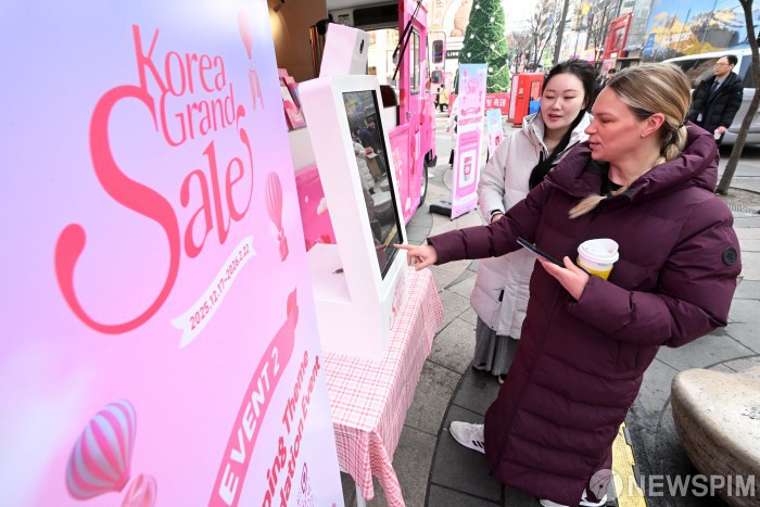 [서울=뉴스핌] 김학선 기자 = 문화체육관광부와 한국방문의해위원회가 외국인의 방한 관광과 소비를 촉진하기 위한 쇼핑관광축제 '2026 코리아그랜드세일'을 내년 2월 22일까지 개최한다. 17일 서울 명동 플레이트럭에서 외국인 관광객이 인공지능(AI) 쇼핑 테마 추천을 체험하고 있다. 2025.12.17 yooksa@newspim.com