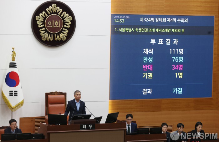 [서울=뉴스핌] 이호형 기자= 조희연 서울시교육감 시절이었던 지난 2024년 6월25일 오후 서울 중구 시의회에서 열린 제324회 정례회 본회의에서 서울학생인권조례 폐지 조례안을 재상정해 가결된 투표 결과를 공개하고 있다. 2024.06.25 leemario@newspim.com