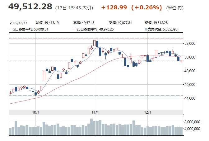 이날 닛케이225평균주가지수는 전일 종가보다 0.26%(128.99엔) 상승한 4만9512.28엔에 거래를 마쳤다. 도쿄증권거래소주가지수(TOPIX, 토픽스)는 0.03%(1.11포인트) 내린 3369.39포인트로 마감했다.