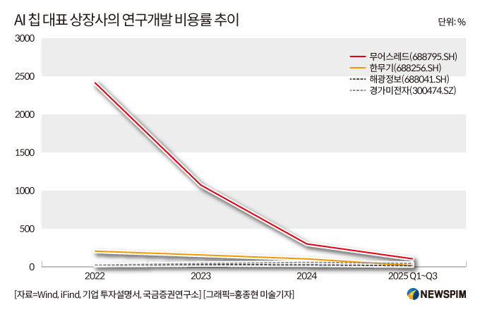 2022년부터 2025년 상반기까지 무어스레드의 연구개발 투자액은 누적 43억 위안을 넘어섰다. 연평균 연구개발 투자금액은 연간 매출액을 상회하면서, 2022년~2025년 상반기 연구개발 비용률은 각각 2422.51%, 1076.31%, 309.88%, 79.33%를 기록했다.