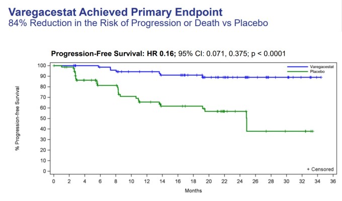 임상시험의 1차 평가 목표인 무진행 생존기간(PFS) 개선에서 바레가세스타트는 위약 대비 통계적으로 유의하고 임상적으로 의미 있는 결과를 도출했다. 질병 진행 또는 사망 위험은 84% 감소했으며, 이는 독립적인 중앙 판독을 통해 확인됐다.