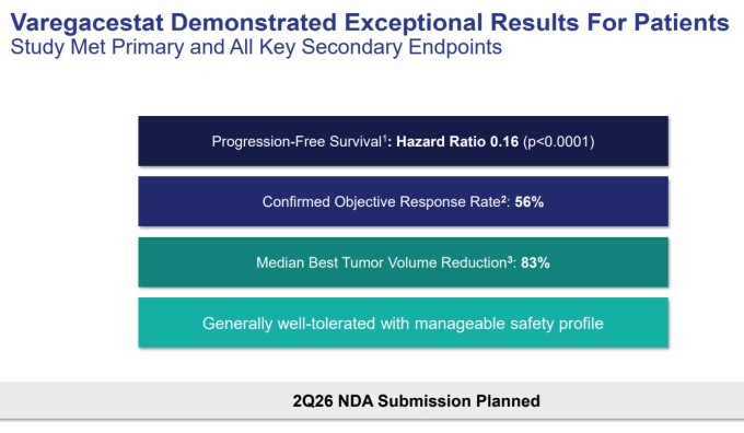 탐색적 분석에서 나타난 종양 용적 변화는 더욱 인상적이다. 바레가세스타트 투여 환자의 종양 용적은 중앙값 기준 83% 감소한 반면, 위약군은 오히려 11% 증가했다. 또한 임상시험은 모든 주요 2차 평가 목표를 충족했으며, 바레가세스타트는 종양 용적 감소와 통증 강도 개선에서 통계적으로 유의한 효과를 입증했다.