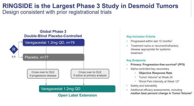 RINGSIDE 임상시험은 글로벌 다기관, 무작위 배정, 이중맹검, 위약 대조 방식으로 진행된 3상 연구다. 총 156명의 진행성 데스모이드 종양 환자가 무작위로 배정되어 하루 1.2mg의 바레가세스타트 또는 위약을 투여받았으며, 질병 진행이나 사망 시까지 치료가 이어졌다.