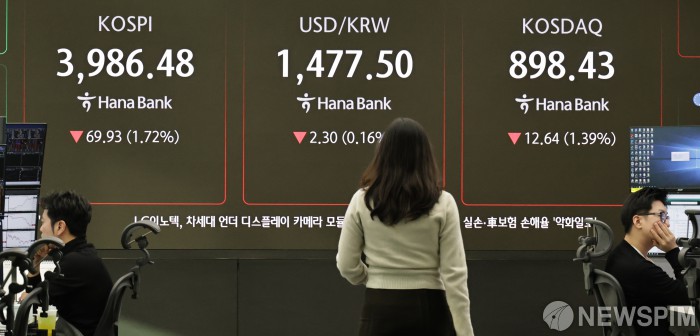 [서울=뉴스핌] 양윤모 기자 = 뉴욕증시가 인공지능(AI) 관련주에 대한 회의론이 확산되며 하락 마감한 가운데, 18일 오전 코스피가 전장 종가보다 69.93 포인트(1.72%) 하락하며 3986.48로, 코스닥은 12.64 포인트(1.39%) 하락한 898.43으로 장을 시작한 가운데, 서울 중구 하나은행 딜링룸에서 직원들이 업무를 보고 있다. 서울외환시장에서 달러/원 환율은 전장 대비 2.30원 하락한 1477.50원에 주간거래를 시작했다. 2025.12.18 yym58@newspim.com