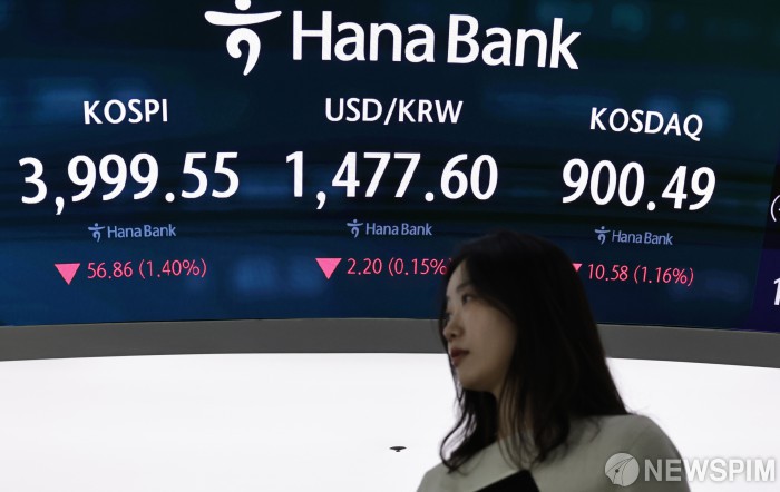[서울=뉴스핌] 양윤모 기자 = 뉴욕증시가 인공지능(AI) 관련주에 대한 회의론이 확산되며 하락 마감한 가운데, 18일 오전 코스피가 전장 종가보다 56.86 포인트(1.40%) 하락하며 3999.55로, 코스닥은 10.58포인트(1.16%) 하락한 900.49로 장을 시작한 가운데, 서울 중구 하나은행 딜링룸에서 직원들이 업무를 보고 있다. 서울외환시장에서 달러/원 환율은 전장 대비 2.50원 하락한 1477.60원에 주간거래를 시작했다. 2025.12.18 yym58@newspim.com