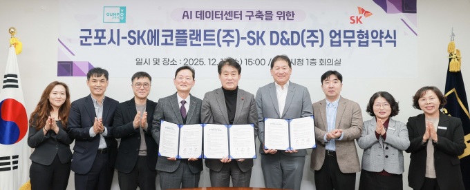[군포=뉴스핌] 박승봉 기자 = 경기 군포시는 지난 17일 시청 회의실에서 SK에코플랜트㈜ (솔루션 사업대표 송영규) 및 SK디앤디㈜ (대표 김도현)와 민·관 상생협력을 통해 군포역세권 복합개발지구 내 AI 데이터센터 구축을 위한 업무협약을 체결했다고 18일 밝혔다.