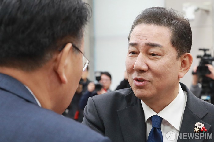 [서울=뉴스핌] 정일구 기자 = 김병기 더불어민주당 원내대표가 18일 오전 서울 여의도 국회 운영위원회 전체회의에서 유상범 국민의힘 의원과 대화를 나누고 있다. 2025.12.18 mironj19@newspim.com
