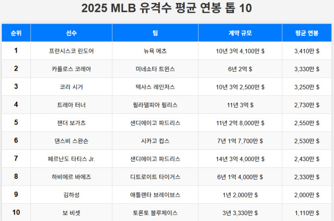 [서울=뉴스핌] 장환수 스포츠전문기자= 메이저리그 유격수 평균 연봉 톱10. [표=AI그록으로 작성] 2025.12.18 zangpabo@newspim.com