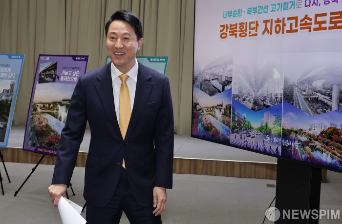 [서울=뉴스핌] 양윤모 기자 = 오세훈 서울시장이 18일 오전 서울시청 3층 대회의실에서 개최된 강북횡단 지하도시고속도로 건설 계획 기자설명회에 참석하고 있다. 강북횡단 지하도시고속도로는 성산 나들목(IC)부터 신내 나들목(IC)까지 서울 강북권을 가로지르는 내부순환로·북부간선도로 지하 약 20.5㎞ 구간에 왕복 6차로 규모로 총사업비 3조4000억 원이 투입돼 내년부터 본격 추진된다. 2025.12.18 yym58@newspim.com