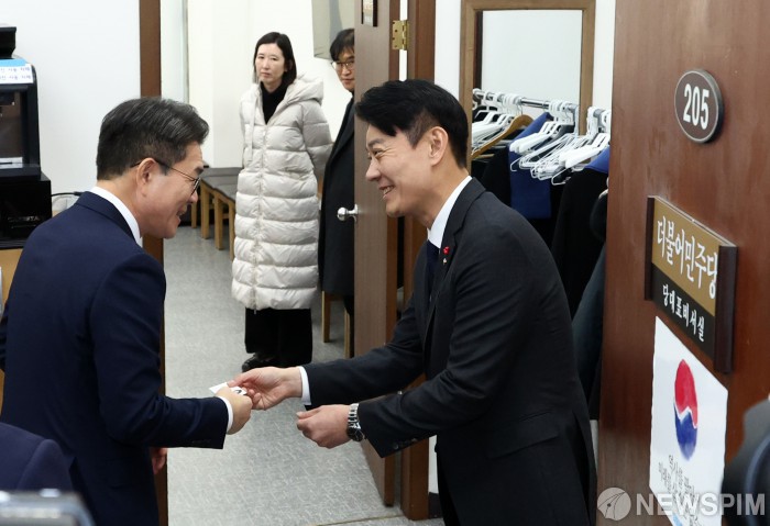 [서울=뉴스핌] 최지환 기자 = 정원오 성동구청장이 18일 오전 서울 여의도 국회에서 정청래 더불어민주당 대표와 면담을 앞두고 한민수 당대표 비서실장과 인사하고 있다. 2025.12.18 choipix16@newspim.com