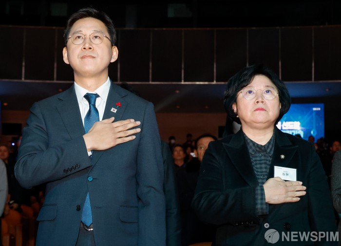 [서울=뉴스핌] 류기찬 기자 = 배경훈 과학기술정보통신부 장관(왼쪽)과 김현 더불어민주당 국회 과방위 간사가 18일 오전 서울 강남구 코엑스에서 열린 ‘국가전략기술 SUMMIT 2025’에서 국민의례를 하고 있다. 2025.12.18 ryuchan0925@newspim.com