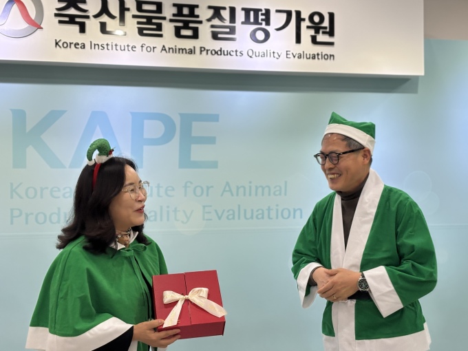 지난 16일 축산물품질평가원에서 진행된 성금 전달식에서 박병홍 축산물품질평가원장(오른쪽)이 산타복을 입고 성금을 전달하고 있다. [사진=축산물품질평가원] 2025.12.18 plum@newspim.com