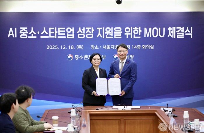 [서울=뉴스핌] 한성숙 중소벤처기업부 장관과 임광현 국세청장이 18일 서울 종로구 서울지방국세청에서 열린 AI 중소·스타트업 성장 지원을 위한 MOU 체결식에서 협약서에 서명한 뒤 기념촬영을 하고 있다. [사진=중소벤처기업부] 2025.12.18 photo@newspim.com