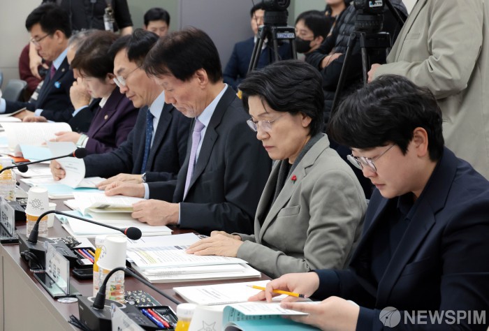 [서울=뉴스핌] 이길동 기자 =최은옥 교육부 차관(오른쪽에서 두번째) 등 참석 교육위원들이 18일 서울 종로구 정부서울청사에서 열린 국가교육위원회 제63차 회의에서 회의 자료를 살펴보고 있다.2025.12.18 gdlee@newspim.com